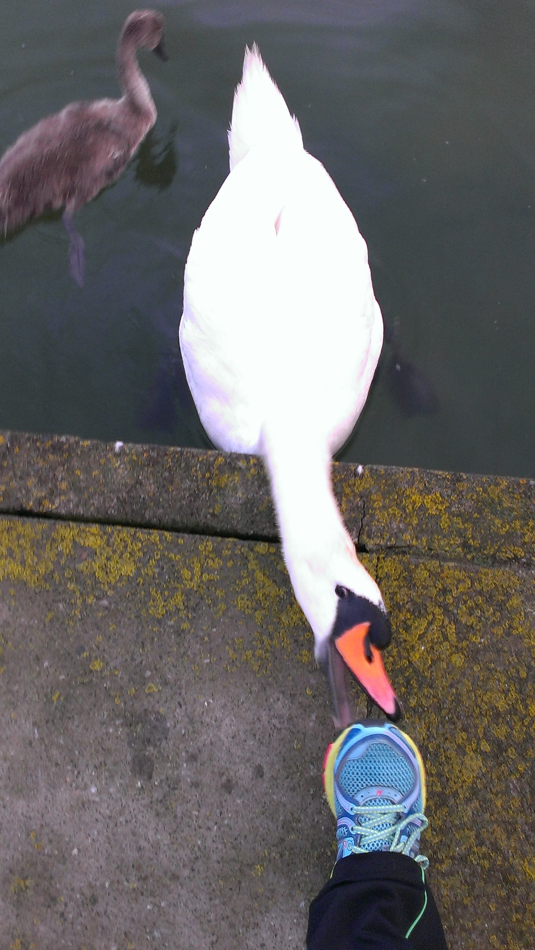 Today at work I analyzed the New York Times’ super cool “Snow Fall” multimedia story. I also pulled together lots of different stories about Tinder and created a mock story on its pros and cons. Pretty productive day. It was sprinkling back at home, but I decided to go out for a solo run and look for photo opportunities. I got some cool shots, but my favorite was the moment a swan swimming in the on-campus lake snapped at my shoe. It also bit my finger and drew blood. Swans are pretty vicious.
