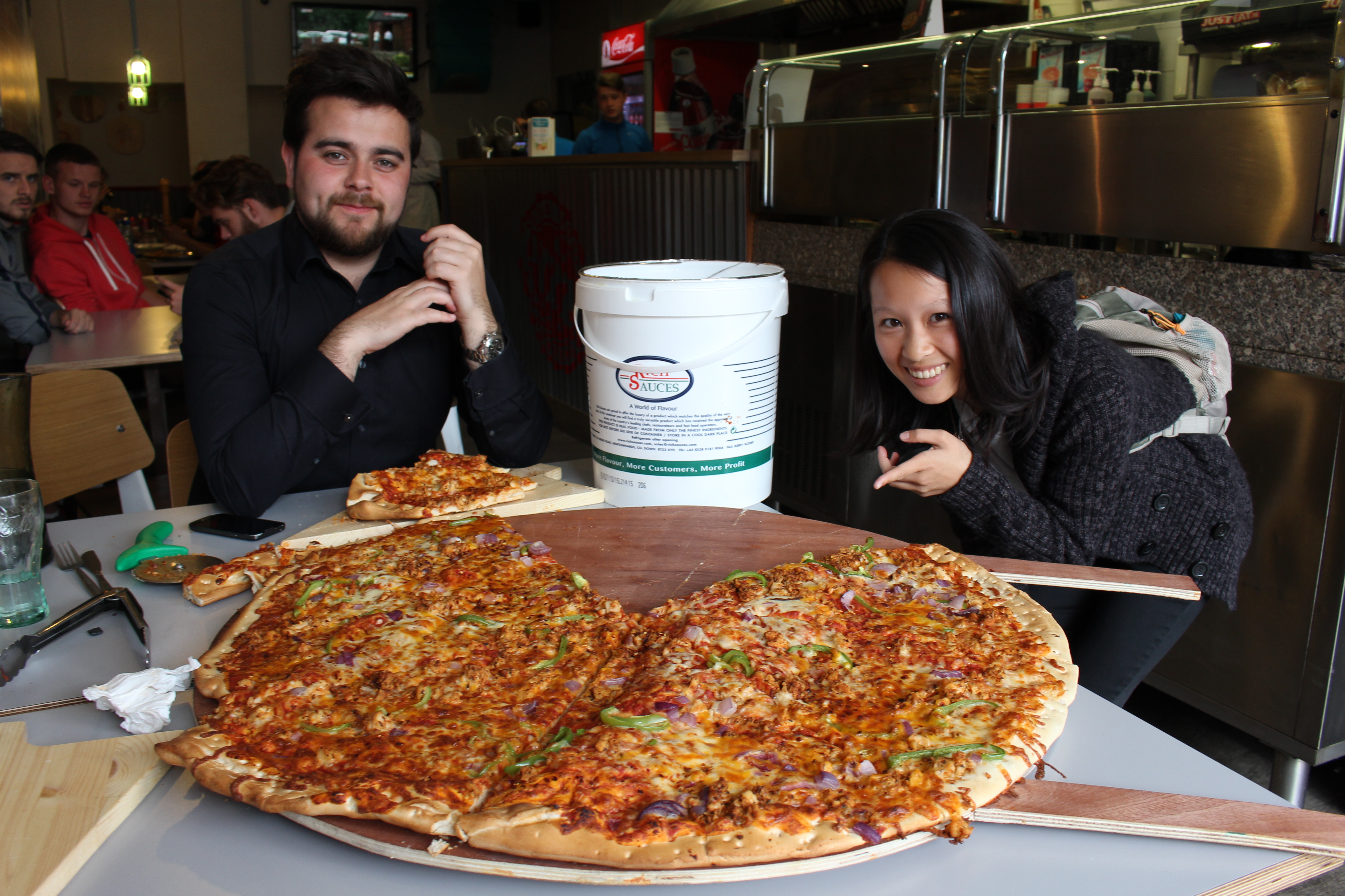 The morning was pretty tranquil, until we went out for a shoot. Our editor was taking on the challenge of eating an enormous pizza under 30 min, and we were going to film the whole thing. We got some shots of the chef making the enormous pizza. Then our editor sat down to eat the whole damn thing and only got about two slices in. He had to give up after the 30 min were over and we packed up the remaining slices of the humongous pizza and everyone in the office marveled over it.